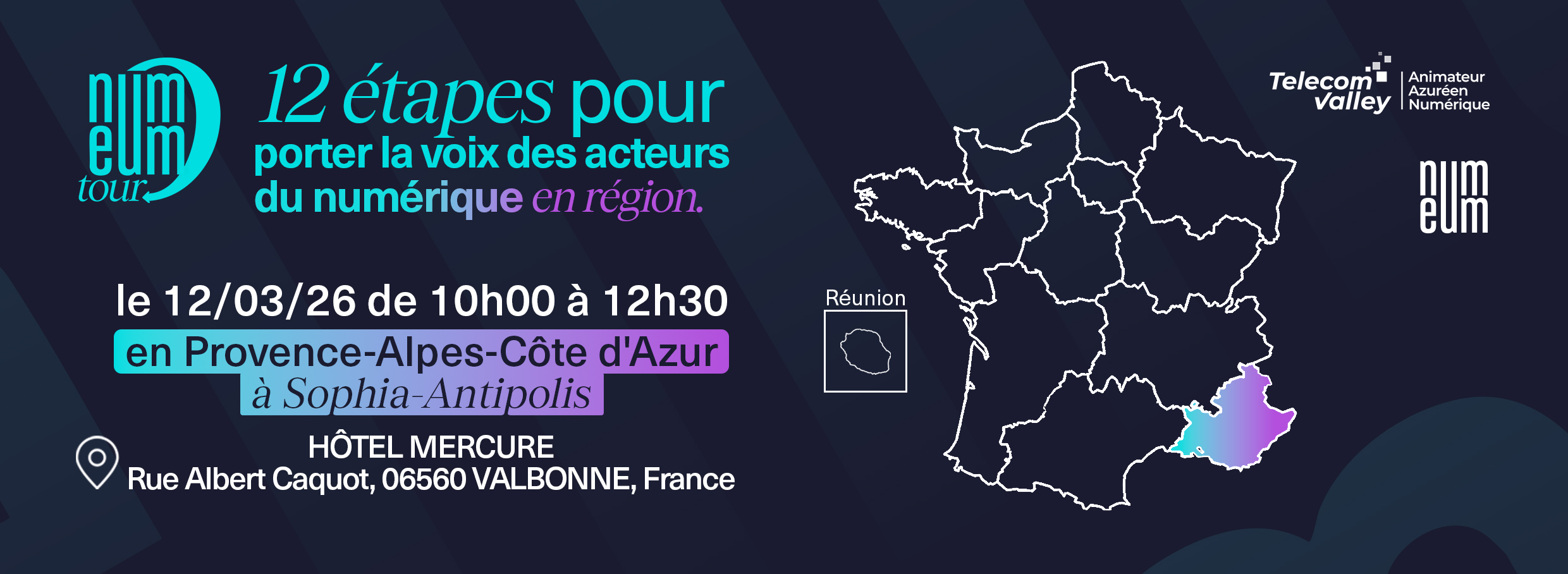Numeum et Telecom Valley ont le plaisir de vous inviter à une nouvelle étape du Numeum Tour à Sophia-Antipolis, organisé en partenariat avec Telecom Valley : un format court, dynamique et inspirant, dédié à la tech, à l’innovation et aux grands enjeux du numérique.