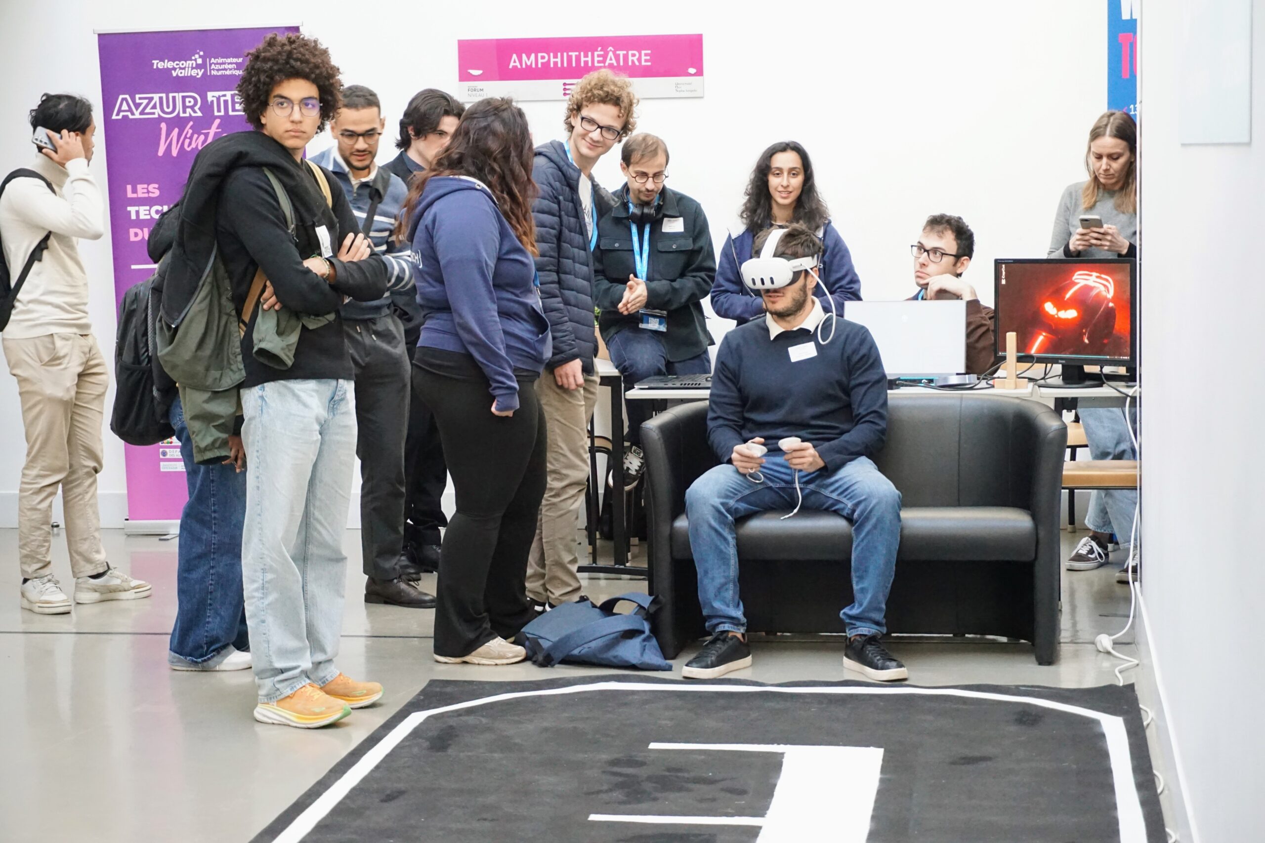 L’innovation locale s’est exprimée, notamment à travers une étonnante démonstration des étudiants d’Epitech Nice : une voiture connectée pilotée en réalité virtuelle par mouvements de tête. Ils ont animé les temps entre les conférences par leur démonstrations et échangé sur leur travail avec des participants curieux.